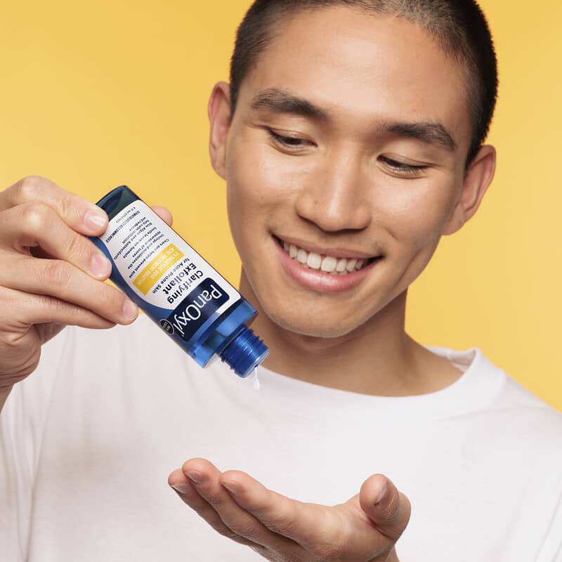 Appliquer l’exfoliant clarifiant PanOxyl – 2% ACIDE SALICYLIQUE sur peau sèche ou légèrement humide